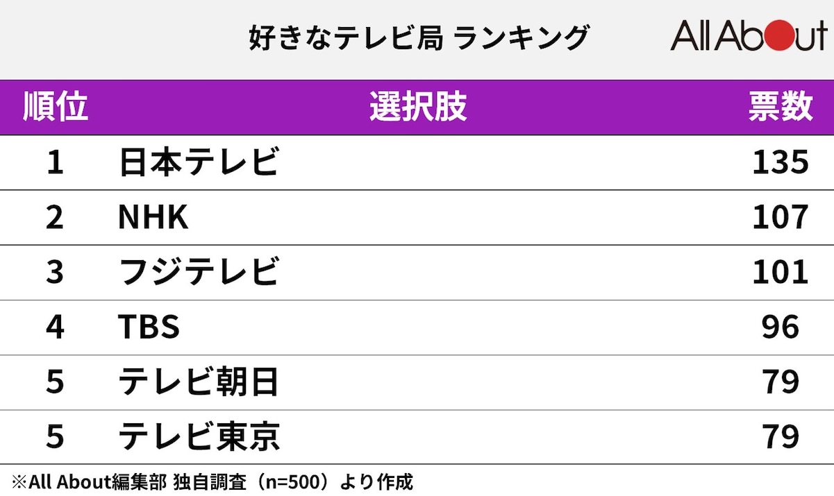 All About編集部は5月29日~6月2日、全国10~70代の男女500人を対象に「テレビ局」に関する独自のアンケート調査を実施しました。