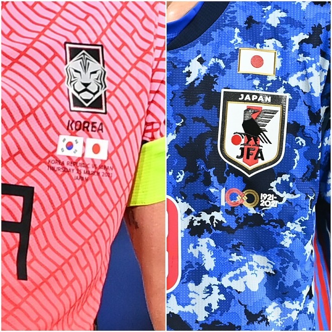 左が問題となっている韓国代表ユニ。右の日本代表ユニには韓国国旗が入っていないが、それは今回が親善試合だったため。アジアカップやW杯予選など公式戦では採用されている。