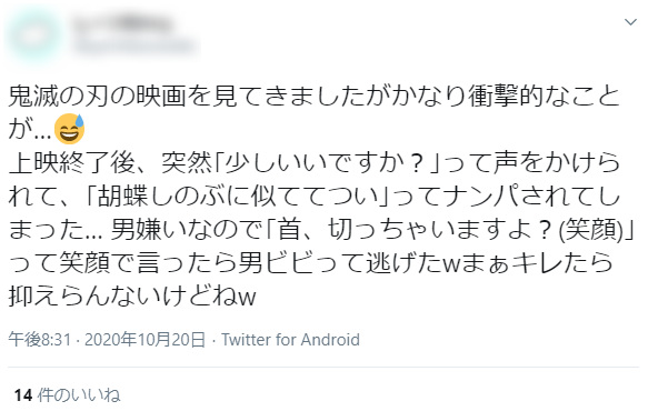 「鬼滅の刃見に行きませんか?」なる鬼滅ナンパが横行 女性「首切るよって言ったら男ビビって逃げた」