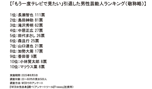『もう一度テレビで見たい引退した男性芸能人』ランキング 5位田代まさし、4位中居正広、3位滝沢秀明、2位島田紳助 1位は…?