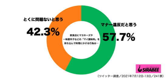 …「飲食店にマヨネーズや一味唐辛子などの『マイ調味料』を持ち込んで料理にかける」場合についてアンケート調査を実施したところ、241票の回答を得ることができ、全体で57.7%の人が「マナー違反だと思う」と回答した。
