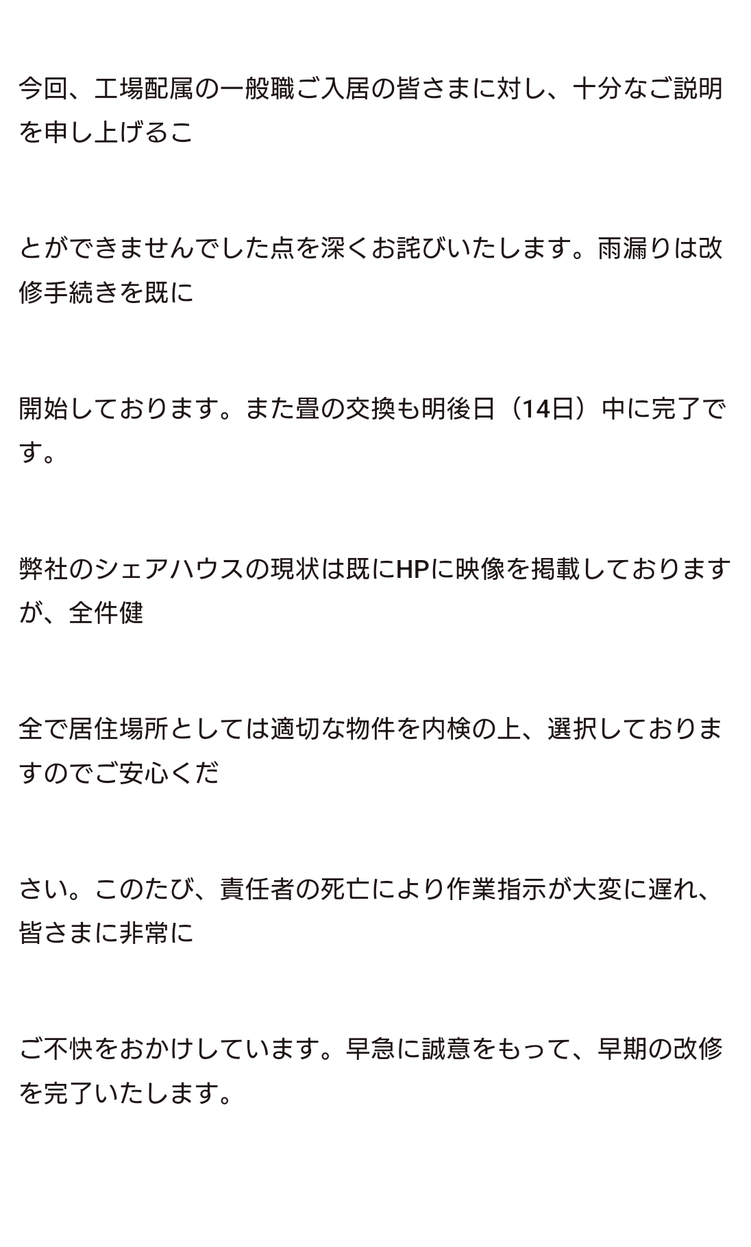 1 : 警備員[Lv.6][苗](庭) [US] :2024/04/13(土) 05:46:29.23 ID:T/UdPhM80●.net BE:886559449-PLT(22000)由比のボロ家報道についてこの度は、由比のボロ家報道につき皆さま方に多大なるご不快をおかけいたし、心よりお詫び申し上げます。ご指摘の点につき、誠意をもって改修に全力を挙げております。誠に申し訳ございませんでした。由比のボロ家・雨漏り住宅と指摘されたシェアハウス1件に関してですが、同地由比のシェアハウス対象物件は計6棟でございます。既に3棟に5名の一般職(転勤のない事務職・工場勤務職)入居者がおり毎日勤務しております。今回の対象は唯一の新規の1棟でした。弊社はこの物件を含め、全てのシェアハウスに関して3月20日~26日にかけ、全家屋の点検・クリーニングを実施、完了しておりました。新卒で、勤務場所に原則異動のない新卒「一般職」社員の各位も新たに上記物件に入居し勤務を開始しております。現在今期、新規一般職の社員は合計で43名、辞令で国内外へ異動する総合職の新卒社員55名も弊社に既に入社し、合計2024年新卒入社済社員は「計98名」となりました。今後、シェアハウス入居者に対しては、ご負担にならないよう実質家賃の請求を0円にて検討し、実施する決意でございます。実は、10月26日に間質性肺炎の急性増悪で緊急入院し、1月10日に死亡、2月1日に社葬となった副社長で、いままで本件の一切の担当責任者だった総務部長がこの入院期間中の詳細な指示が酸素吸入による呼吸困難でほぼできず、空白となってしまいました。会社は3月15日付で新総務担当を急遽任命したものの改修自体に残った期限に余裕がなく、修正が極めて遅れました点、心よりお詫びいたします。いままでシェアハウスの改修のほぼ一切は逝去した副社長の担当でした。今回職場異動のない新卒一般職の16名の方々がご入社辞退となり、心よりお詫びいたします。大変申し訳ありませんが、写真のコンクリート剥き出しの場所は洗濯機置き場で、現在は既に洗濯機が置いてありますので現状の映像は異なっています。全文https://www.inaba-foods.jp/topics/detail/1068