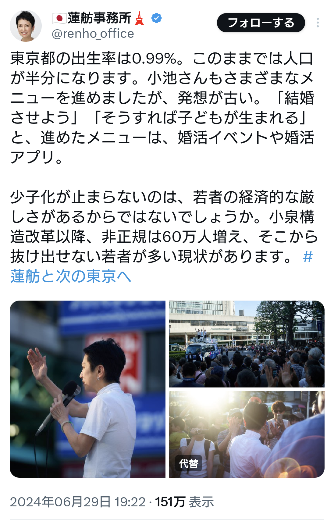 東京都の出生率は0.99%。このままでは人口が半分になります。小池さんもさまざまなメニューを進めましたが、発想が古い。「結婚させよう」「そうすれば子どもが生まれる」と、進めたメニューは、婚活イベントや婚活アプリ。…