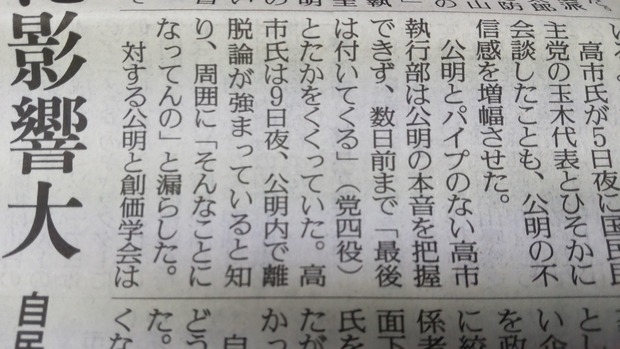 「高市執行部は公明の本音を把握できず(中略)高市氏は9日夜、公明内で離脱論が強まっていると知り、周囲に『そんなことになってんの』と漏らした」(省略)