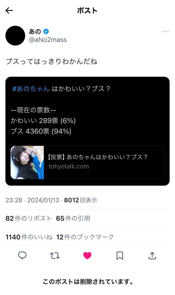 4 名前:名無しさん@おーぷん[] 投稿日:24/01/15(月) 19:41:30 ID:YpWUさすがにかわいそう5 名前:名無しさん@おーぷん[] 投稿日:24/01/15(月) 19:41:33 ID:wQxV草6 名前:名無しさん@おーぷん[] 投稿日:24/01/15(月) 19:41:42 ID:L83Q普通に可愛いやん8 名前:名無しさん@おーぷん[] 投稿日:24/01/15(月) 19:41:54 ID:oSx5流石に逆張りが過ぎる9 名前:名無しさん@おーぷん[] 投稿日:24/01/15(月) 19:42:01 ID:kfRQブスやな続きを読む