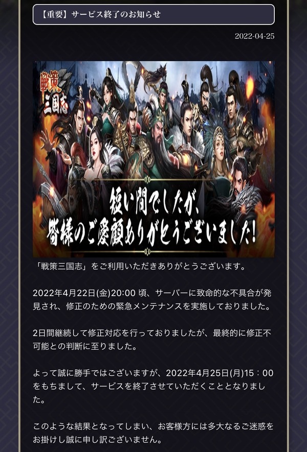 【悲報】あの大人気スマホゲームさん、バグが治せなくなりサービス終了wwwwww