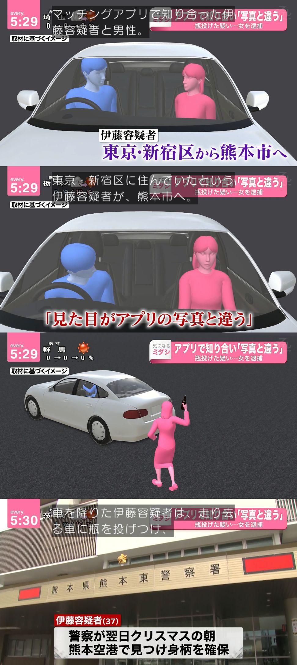 【熊本】マッチングアプリで知り合い「見た目が写真と違う」と口論に…走り去る車にビンを投げつけガラス割った疑い 無職の女(37)逮捕