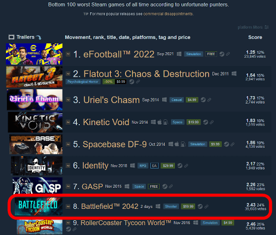 【悲報】バトルフィールド2042さん、Steamで史上最悪の評価のゲームの一角になってしまうwww