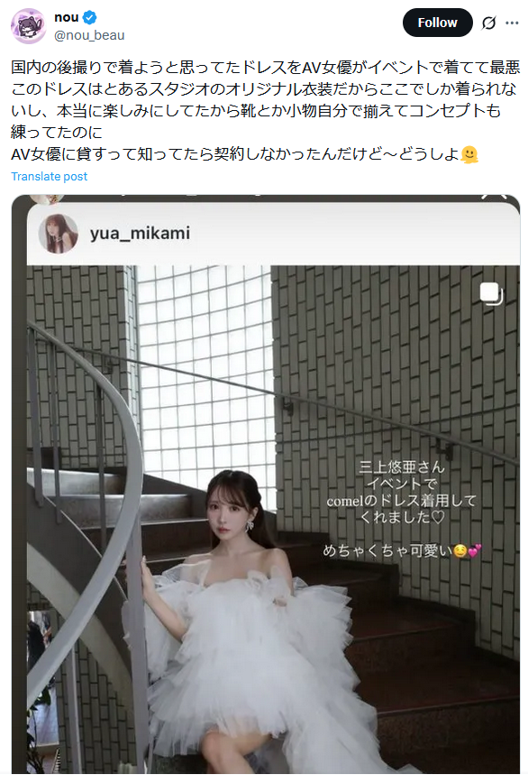 1 名前:名無しさん@おーぷん[] 投稿日:25/07/30(水) 16:31:14 ID:Z4pWこんなに綺麗な方なのに、AV女優と同じドレスは無理って言っただけで男共からクソみたいなコメント投げられてて気の毒でしかない https://t.co/hEDsS5cLTr— あやこ (@AYAHIMEKO0309) July 28, 2025 2 名前:名無しさん@おーぷん[] 投稿日:25/07/30(水) 16:31:23 ID:Z4pW