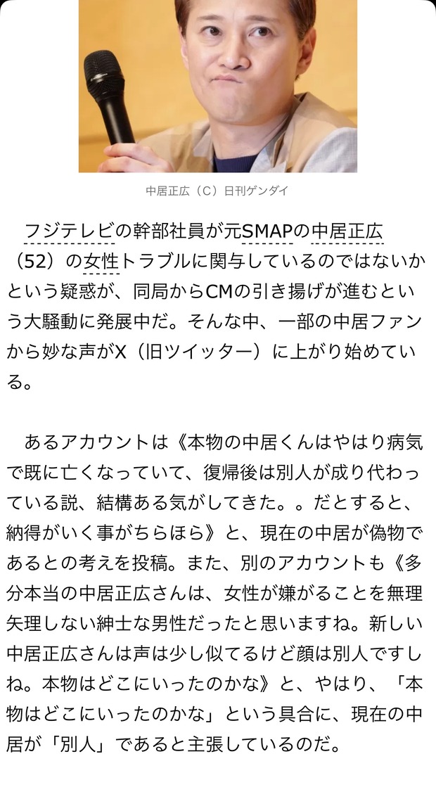 一部ファンが現実逃避? 中居正広“別人疑惑”再燃…「本人すでに死亡」と考える人々が現れる|日刊ゲンダイDIGITAL