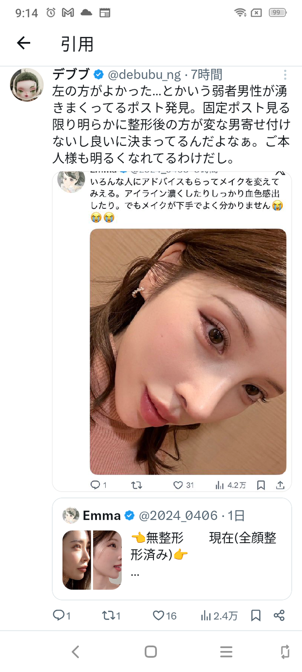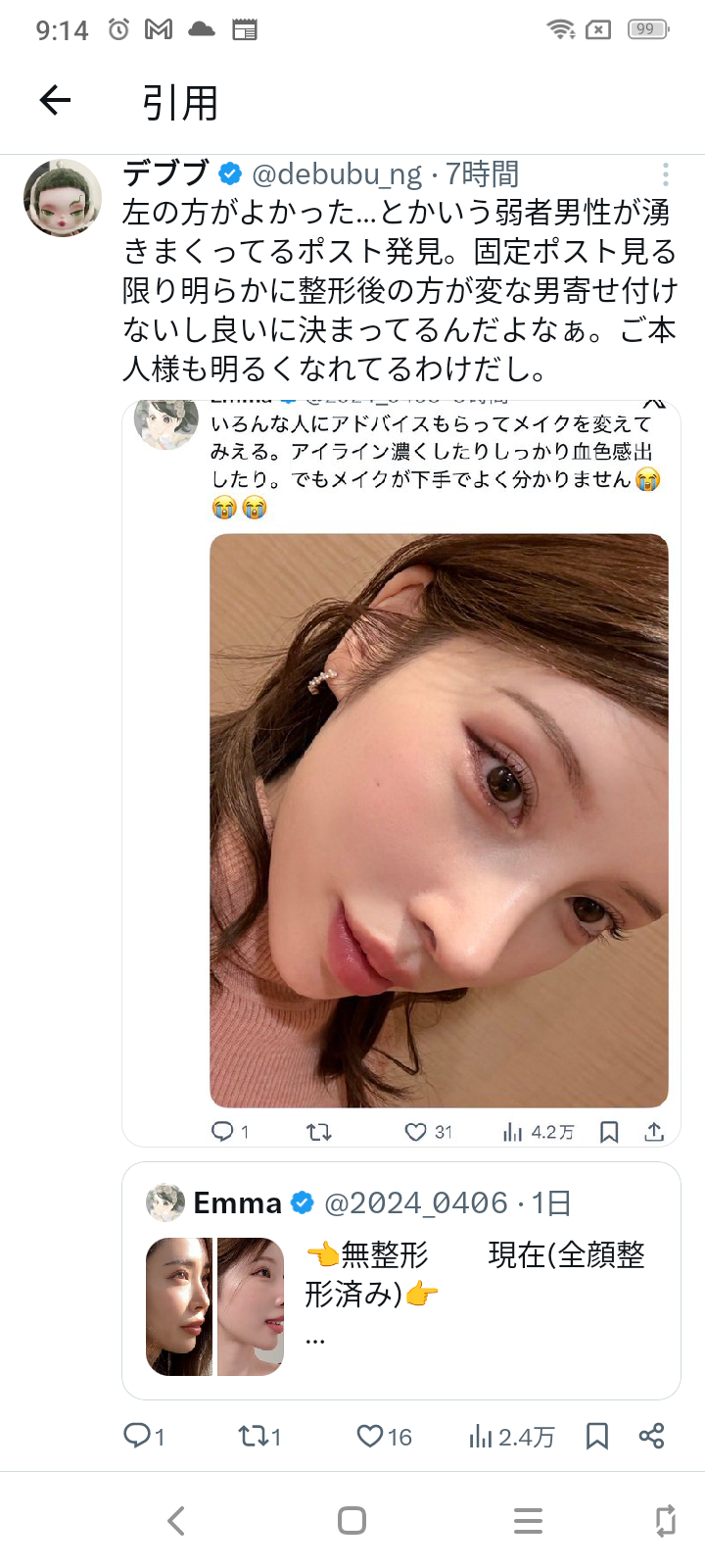 👈無整形 現在(全顔整形済み)👉昔、鼻がコンプレックスでマスクで隠す→そのせいで肌も荒れる→肌も鼻も見せたくなくてマスク外せない。って言う負の連鎖のつらい日々だった、、現代の美容医療とお医者様方にとてつもなく感謝している😭 pic.twitter.com/NEOWkzQrnE— Emma (@2024_0406) November 21, 2025