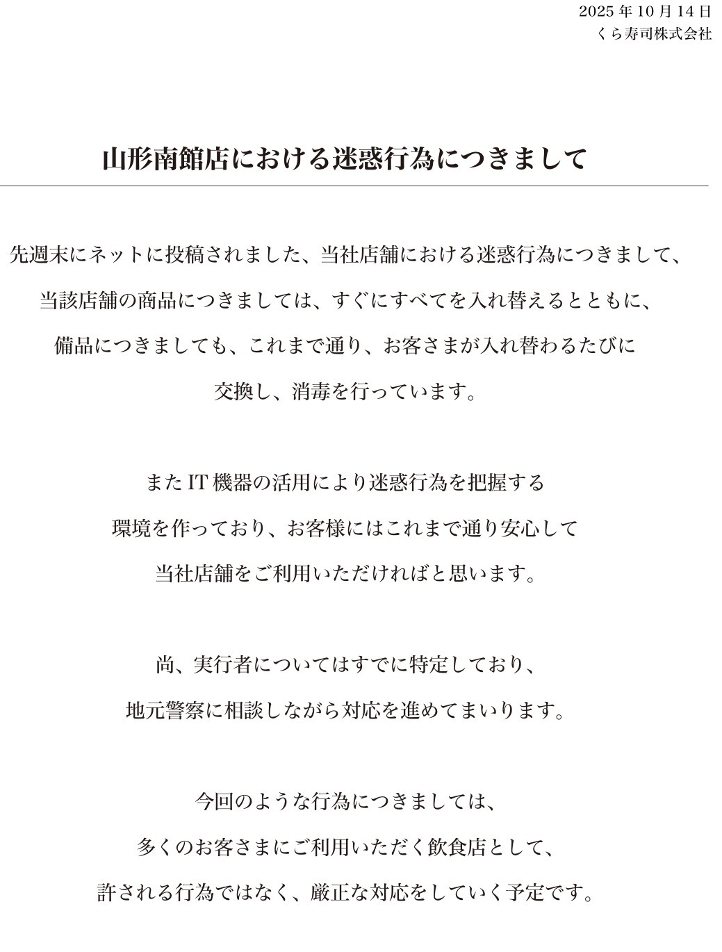 1 名前:名無しさん@おーぷん[] 投稿日:25/10/14(火) 14:57:48 ID:GBGQ賠償金が楽しみやね【声明発表】くら寿司で客が醤油さしなめる迷惑行為、実行者は特定し「地元警察に相談」https://t.co/U3YsOinKM2備品について「これまで通り、お客さまが入れ替わるたびに交換し、消毒を行っています」と報告。迷惑行為の実行者はすでに特定しており、地元警察に相談しながら対応を進めるとした。 pic.twitter.com/0F3gFj3CEU— ライブドアニュース (@livedoornews) October 14, 2025 5 名前:名無しさん@おーぷん[] 投稿日:25/10/14(火) 15:05:07 ID:uqeW