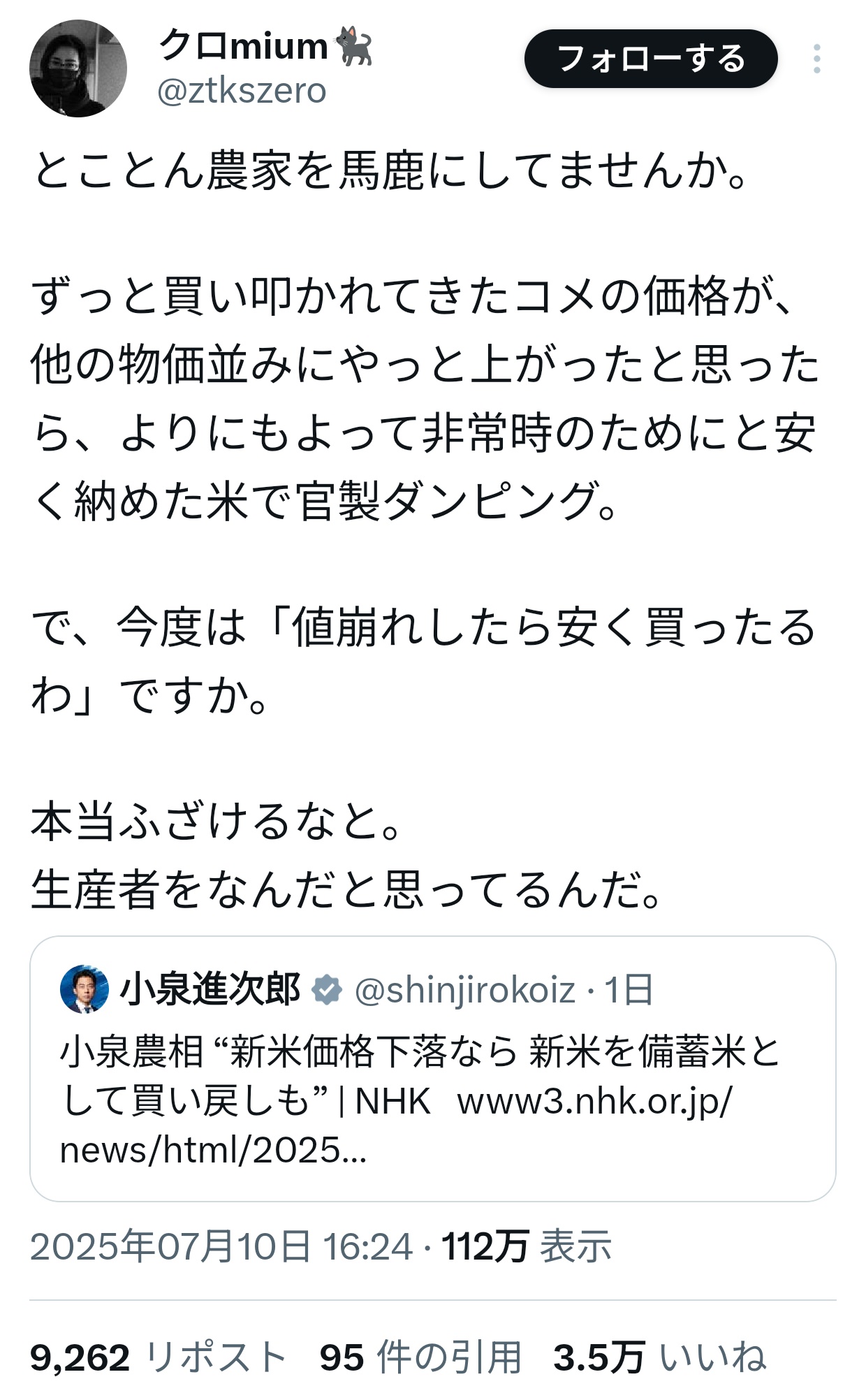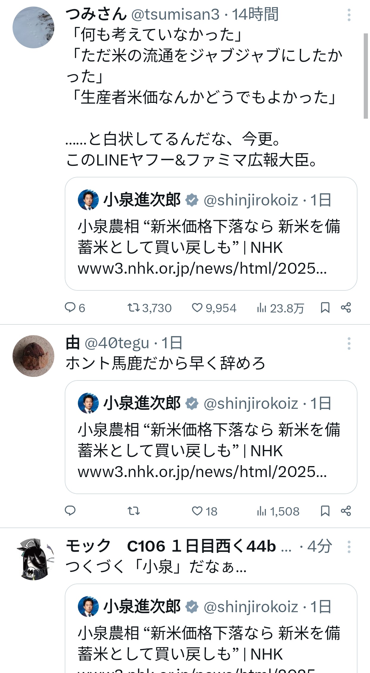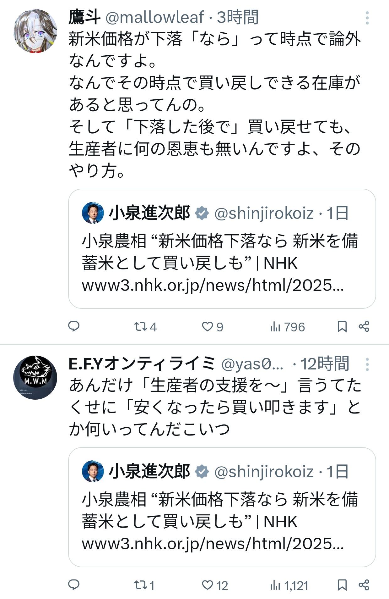 【悲報】小泉進次郎農相「新米が安くなったら備蓄米として買ってやるわw」←またしても大炎上へ