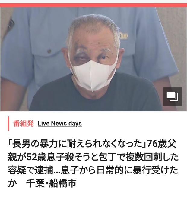 「長男を包丁で刺した」自ら110番…殺人未遂容疑で76歳父を逮捕 「暴力に耐えられなくなった」父の顔には大きなアザが…|FNNプライムオンライン