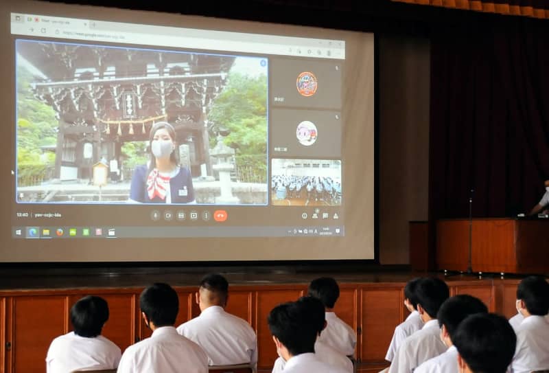 新型コロナウイルスの影響で修学旅行が中止となった、青森県立八戸水産高(福嶋信校長)の2、3年生190人は1日、ビデオ会議システム「グーグルミート」を使い、同校体育館と京都をつないだオンライン修学旅行を実施した。県内では珍しい試みで、現地のバスガイドによる生中継や、動画配信で有名な寺院を巡る体験を通じ、旅行の雰囲気を味わった。
