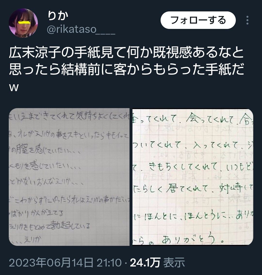 【悲報】風俗嬢「客から広末涼子みたいな手紙もらった!!」