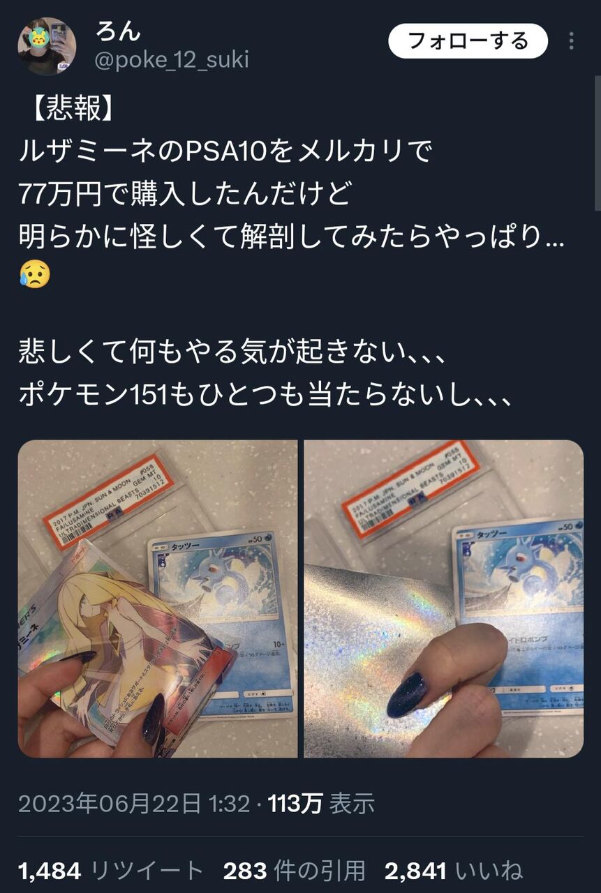 【悲報】77万円のポケモンカードをメルカリで買った女さん、偽物で咽び泣く