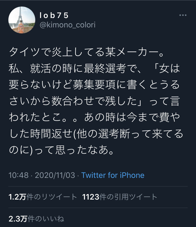 【悲報】Twitter女子「例のタイツメーカーに面接行ったら『女は取らない』と追い返されました」