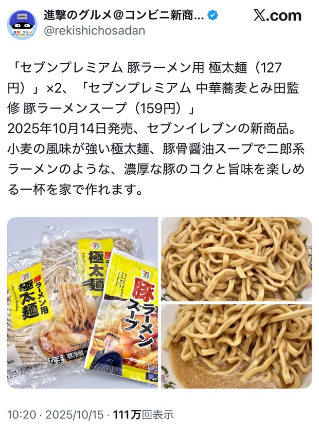 「セブンプレミアム 豚ラーメン用 極太麺(127円)」×2、「セブンプレミアム 中華蕎麦とみ田監修 豚ラーメンスープ(159円)」2025年10月14日発売、セブンイレブンの新商品。小麦の風味が強い極太麺、豚骨醤油スープで二郎系ラーメンのような、濃厚な豚のコクと旨味を楽しめる一杯を家で作れます。
