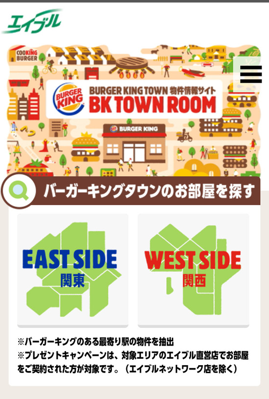 上記のお客様の声やご要望について社内で会議を重ねた結果、お客様にバーガーキングR のお店の近くに引っ越していただくことで解決できないだろうか、と考えバーガーキングR 店舗の近隣のお部屋探しができる物件情報サイト「BK TOWN ROOM」をスタートすることにいたしました。