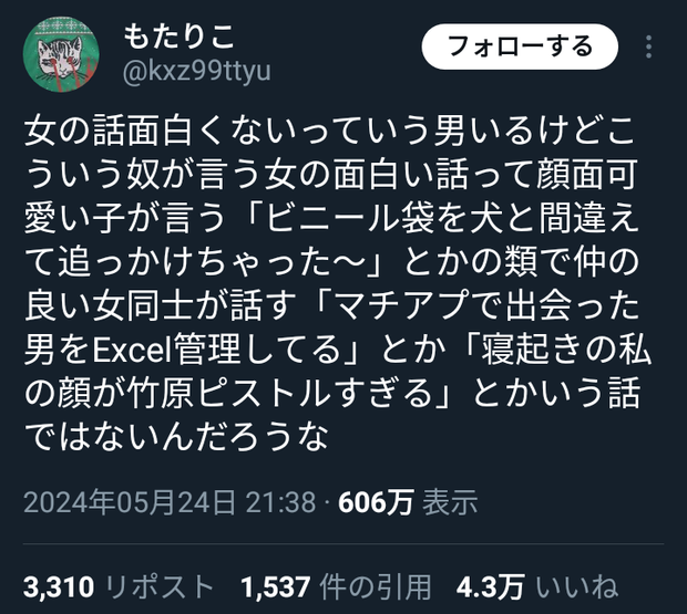 【朗報】女さん「女の話は面白くないって男へ、これが本当の面白い女ね」→4.3万いいね!