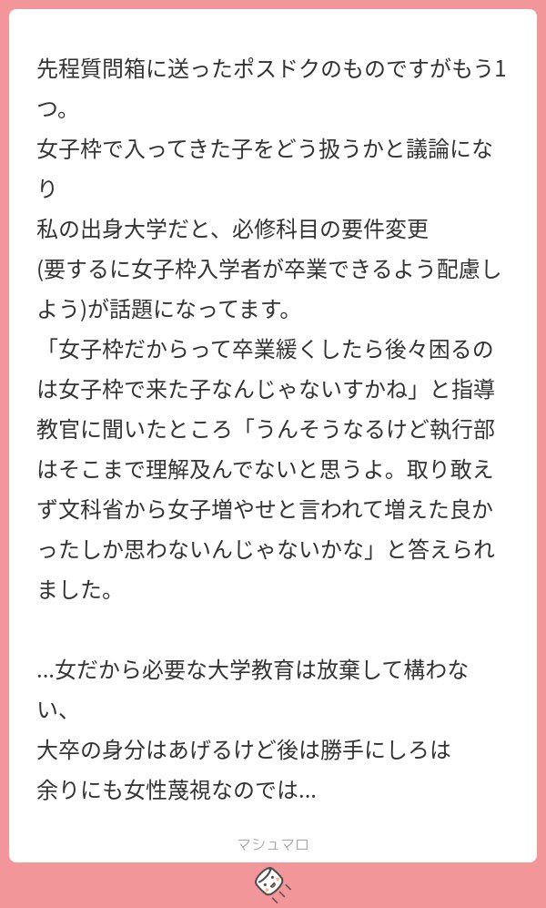 まぁ同水準の学力がないのに入学を許可してる以上は仕方ないですよね。大学側だって本音では女子学生の未来とかどうでもよく文科省から予算が貰いたいだけなわけで、女子枠は「お客様」として学位だけばら撒いてテキトーにあしらうのが最適解になる。 pic.twitter.com/MV7plRYUj1— 小山(狂) (@akihiro_koyama) May 22, 2025 素晴らしい...2 名前:名無しさん@おーぷん[] 投稿日:25/05/22(木) 12:56:17 ID:qQQVワイ今度日本に生まれるなら絶対女の子に産まれてくる3 名前:名無しさん@おーぷん[] 投稿日:25/05/22(木) 12:57:51 ID:QNrgそりゃ生まれつき男女の知能に差があるなら、下駄はかせんと不公平やからな4 名前:名無しさん@おーぷん[] 投稿日:25/05/22(木) 12:59:03 ID:qQQV>>3みんなが欲しいのは機会の平等ではなく結果の平等はっきりわかんだね続きを読む