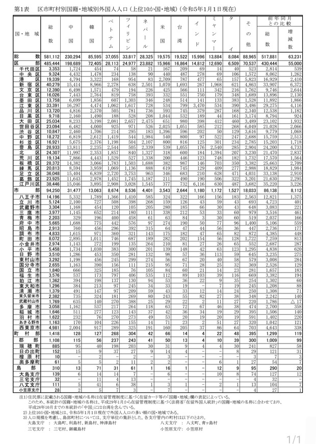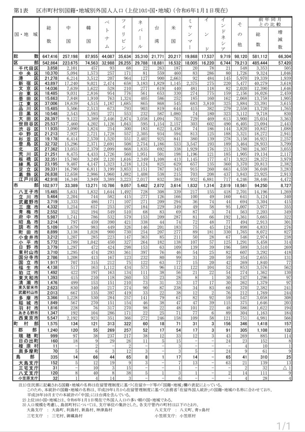 たった1年で中韓フィリピンベトナム中心に7万人弱外国人が増加