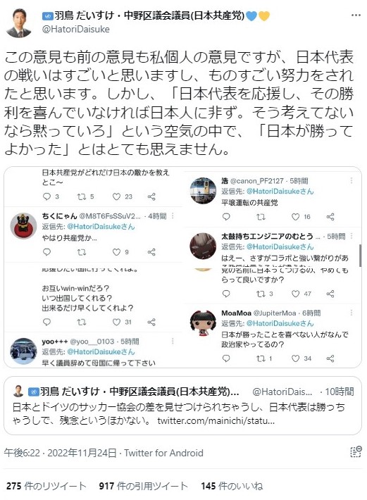 【画像】「日本代表は勝っちゃうし残念」とツイートした議員さん、とんでもない釈明をしてしまうwww