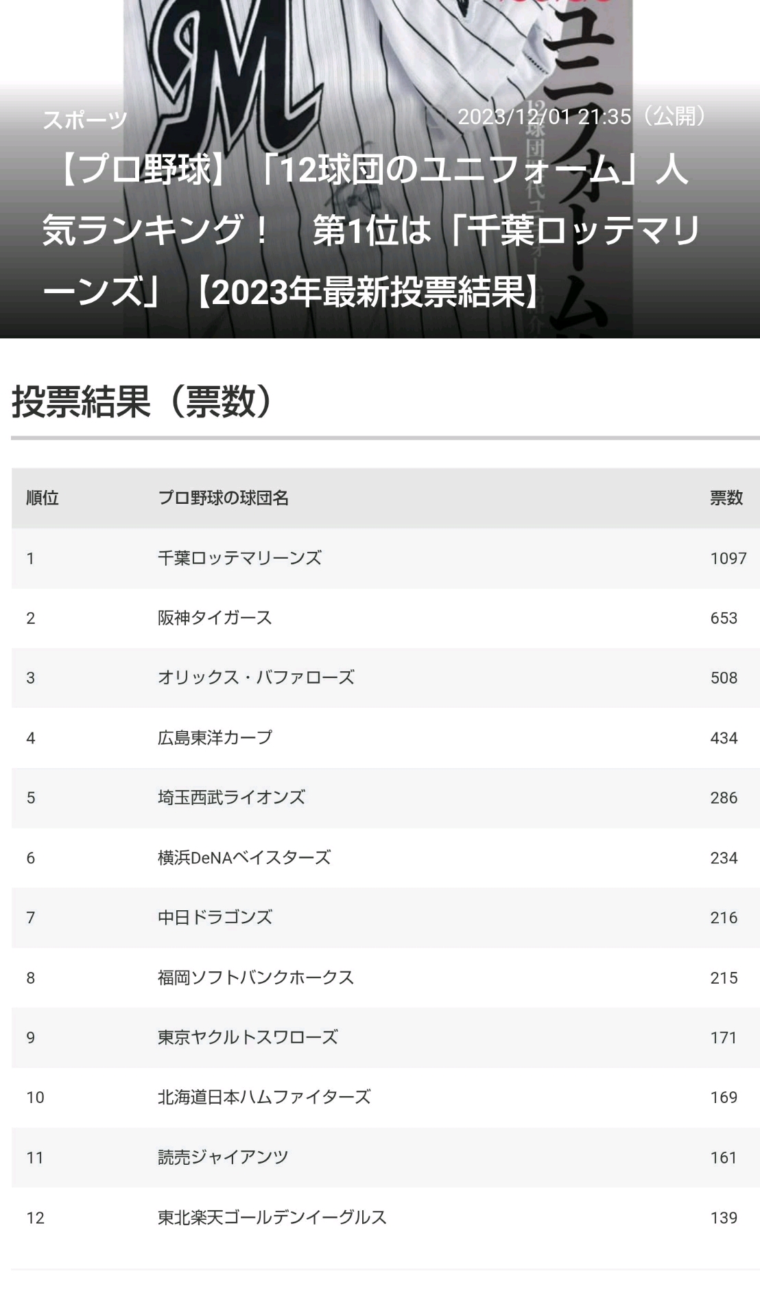 【画像】「12球団のユニフォーム」人気ランキング、2023年最新版が発表www