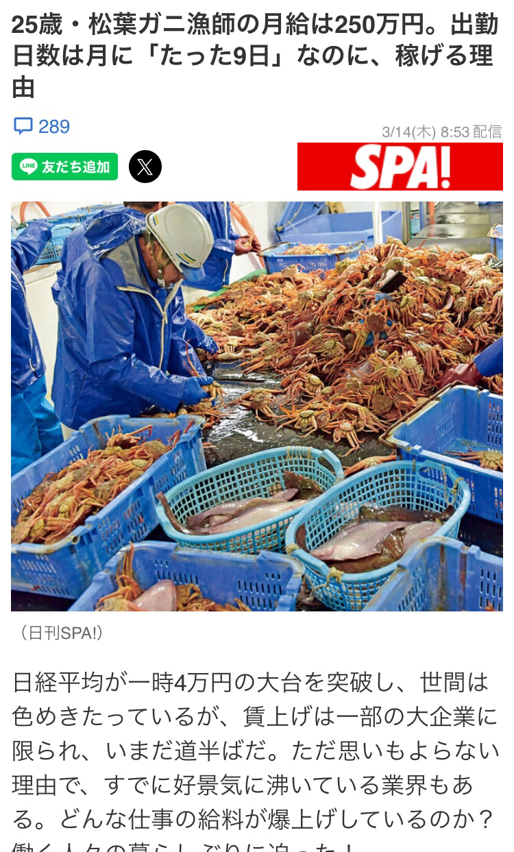 25歳・松葉ガニ漁師の月給は250万円。出勤日数は月に「たった9日」なのに、稼げる理由(週刊SPA!) - Yahoo!ニュースhttps://news.yahoo.co.jp/articles/8976559a1aa6320a2aad66d07eac1a331eff36ee転載元スレッド:https://viper.2ch.sc/test/read.cgi/news4vip/1710413089/