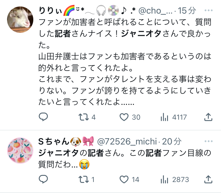 ジャニオタ記者「私は昔からジャニーズが大好きでファンです。今回の問題んでファンも加害者だと言われるのはおかしい!」