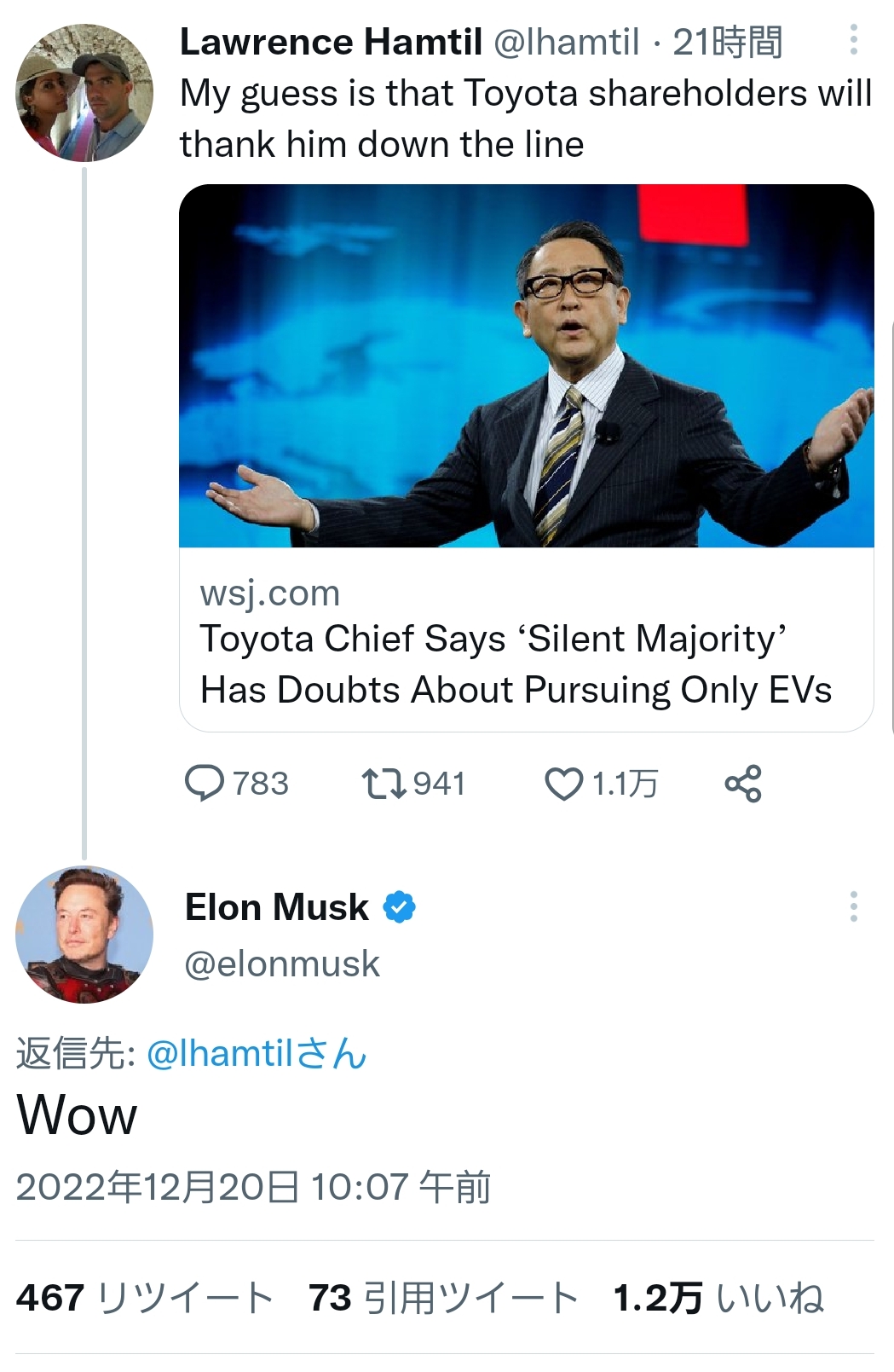1: 以下、ニュー速クオリティでお送りします 2022/12/21(水) 00:47:33.33 ID:KH+E47ut0 豊田章男「自動車業界に携わるサイレントマジョリティはEVを将来の唯一の選択肢とすることに疑問を抱いている。