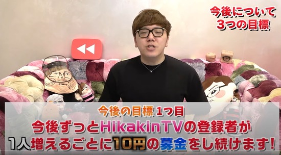 【画像】ヒカキン、これから登録者1人増えるごとに一生10円募金する模様wwwwwww