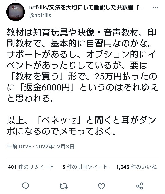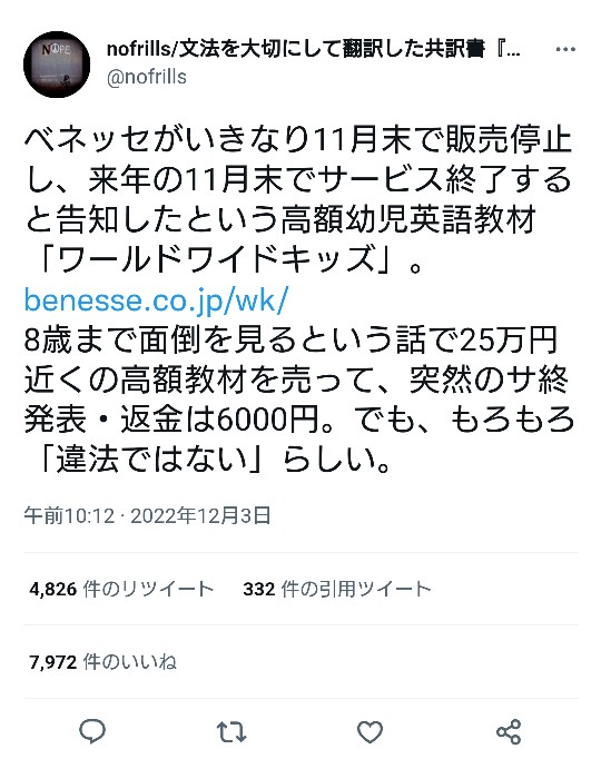 【画像】ベネッセ「手厚いサポートの幼児英語教材25万円や!」→「すまんサ終するわw返金6000円なw」