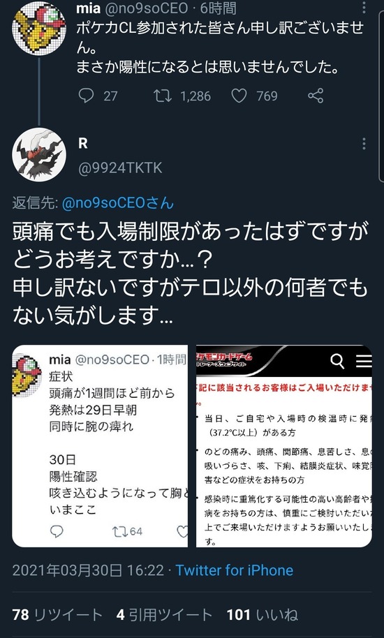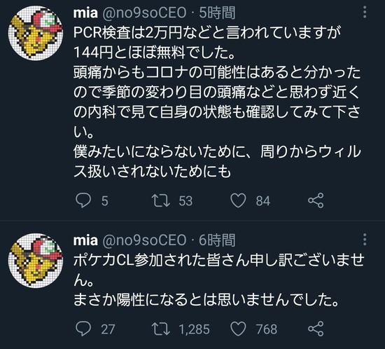 【画像】ポケモンカード大会出場者さん、頭痛を隠して出場し、大会2日後にコロナ陽性が発覚してしまうww