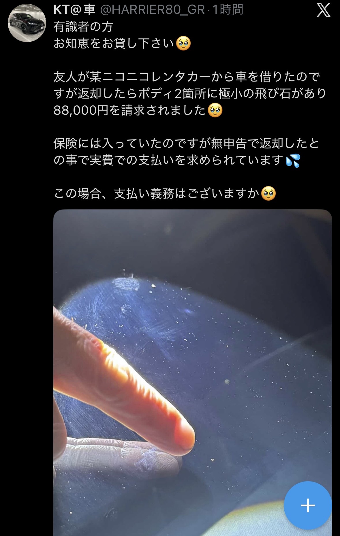 有識者の方お知恵をお貸し下さい🥹友人が某ニコニコレンタカーから車を借りたのですが返却したらボディ2箇所に極小の飛び石があり88,000円を請求されました🥹保険には入っていたのですが無申告で返却したとの事で実費での支払いを求められています💦この場合、支払い義務はございますか🥹