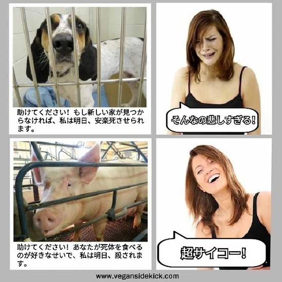 【画像】ヴィーガン「何故あなた達は豚と犬の命に優劣をつけるのですか?」
