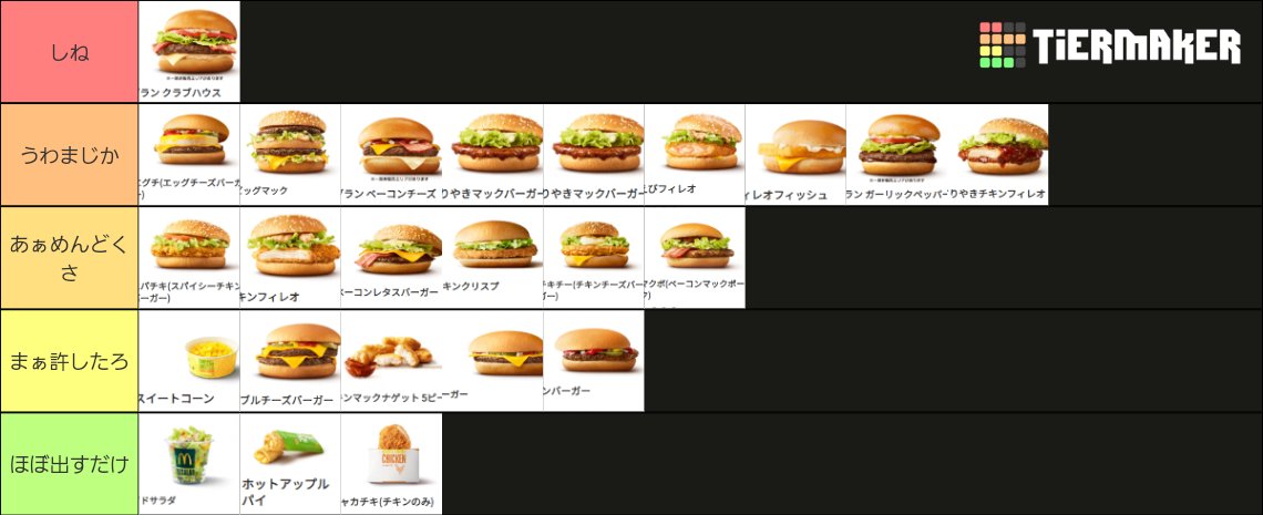 元マック店員が選ぶ注文来たときの心境tier表 pic.twitter.com/GcyhN0M4Vj— めがっちP/Megatti P (@MegattiP016) August 10, 2024 2 名前:名無しさん@おーぷん[] 投稿日:24/08/11(日) 07:46:05 ID:VqVgマクド、な?3 名前:名無しさん@おーぷん[] 投稿日:24/08/11(日) 07:46:31 ID:EfjCマクナルガイジ消えろや4 名前:名無しさん@おーぷん[] 投稿日:24/08/11(日) 07:46:36 ID:Uc1Aほなクラブハウスサンド頼んだろw5 名前:名無しさん@おーぷん[] 投稿日:24/08/11(日) 07:46:40 ID:diU4ほな働くなや死ね7 名前:名無しさん@おーぷん[] 投稿日:24/08/11(日) 07:46:59 ID:VqVg>>5アルバイトしたことなさそう続きを読む
