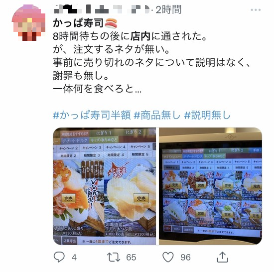 【画像】半額の日のかっぱ寿司、8時間待たされた挙句、寿司はほとんど完売wwwww