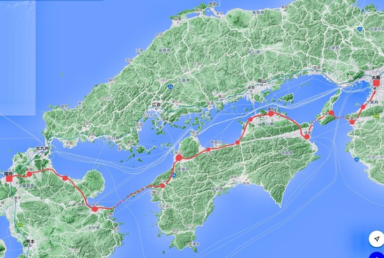 大阪ー和歌山ー淡路島ー徳島ー香川ー愛媛ー大分ー博多