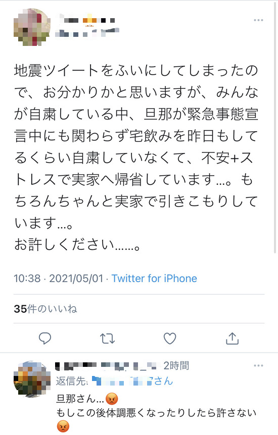 【画像】女さん、家でゆっくり宅飲みしてる夫を「自粛してない」と喚き散らすwww