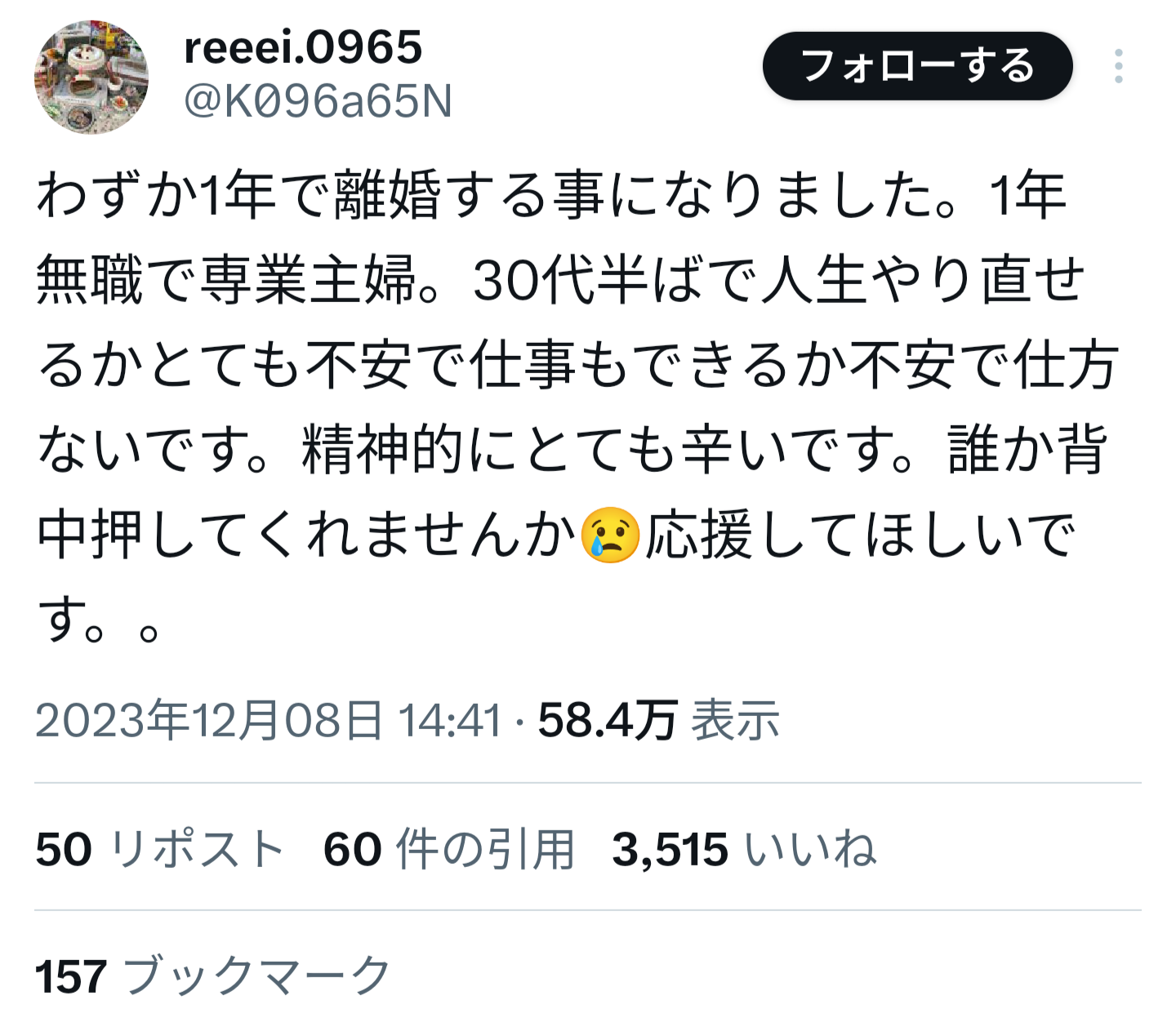 【画像】女さん「わずか1年で離婚することになりました……30代半ばで人生やり直せるかとても不安です」