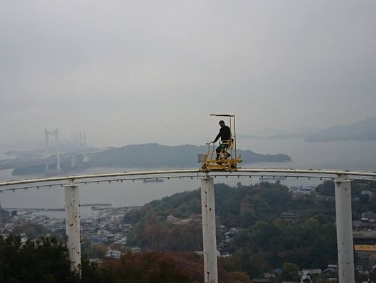 自転車で錆びついた道を自分で漕いで進むスカイサイクル