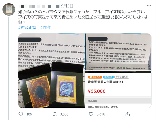 知り合い?の方がラクマで詐欺にあった。ブルーアイズ購入したらブルーアイズの写真送って来て脅迫めいた文面送って運営は知らんぷりしないよね?