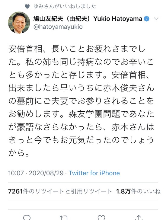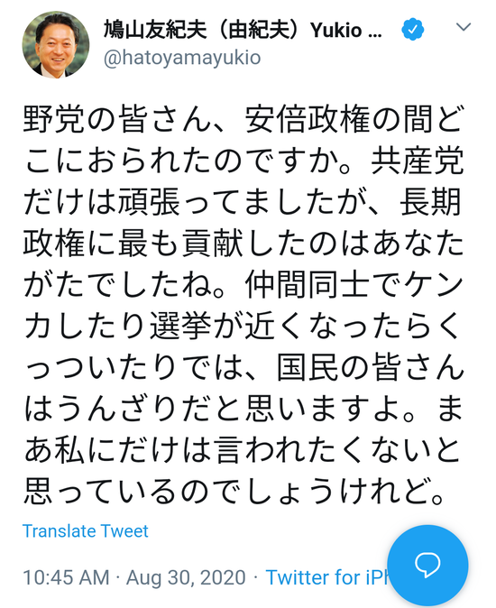 【画像】鳩山由紀夫さん、全方位に喧嘩を売ってしまうwwwwwwww