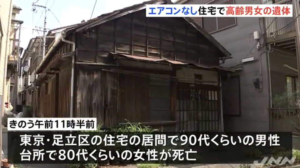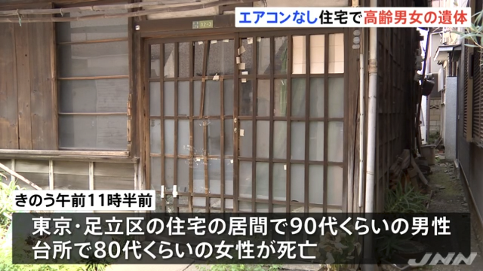 21日、東京・足立区の住宅で、高齢の夫婦とみられる遺体が見つかりました。住宅にはエアコンがなく、警視庁は熱中症で死亡した可能性があるとみて調べています。