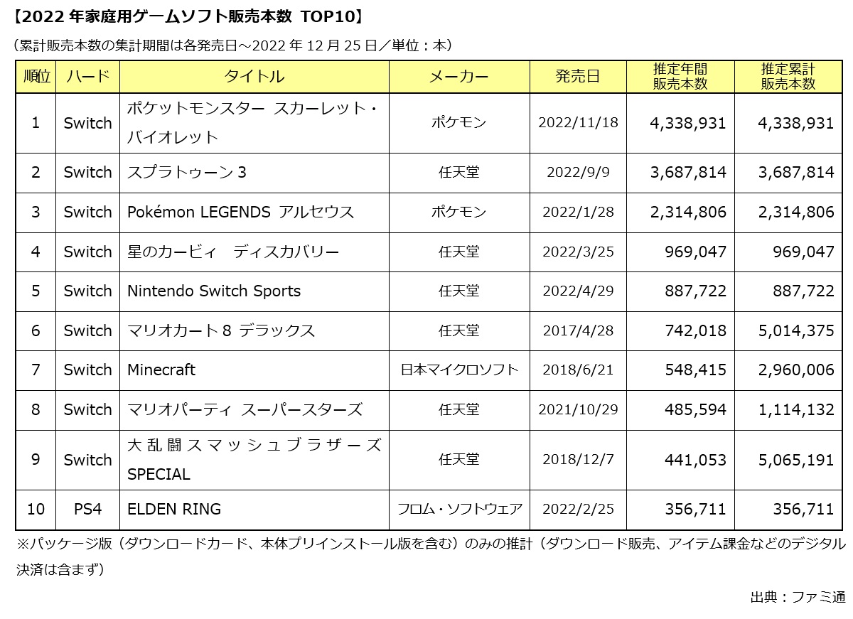 2位以降もSwitchのソフトが独占し、2位は『スプラトゥーン3』(任天堂)、3位は『Pokemon LEGENDS アルセウス』(ポケモン)だった。