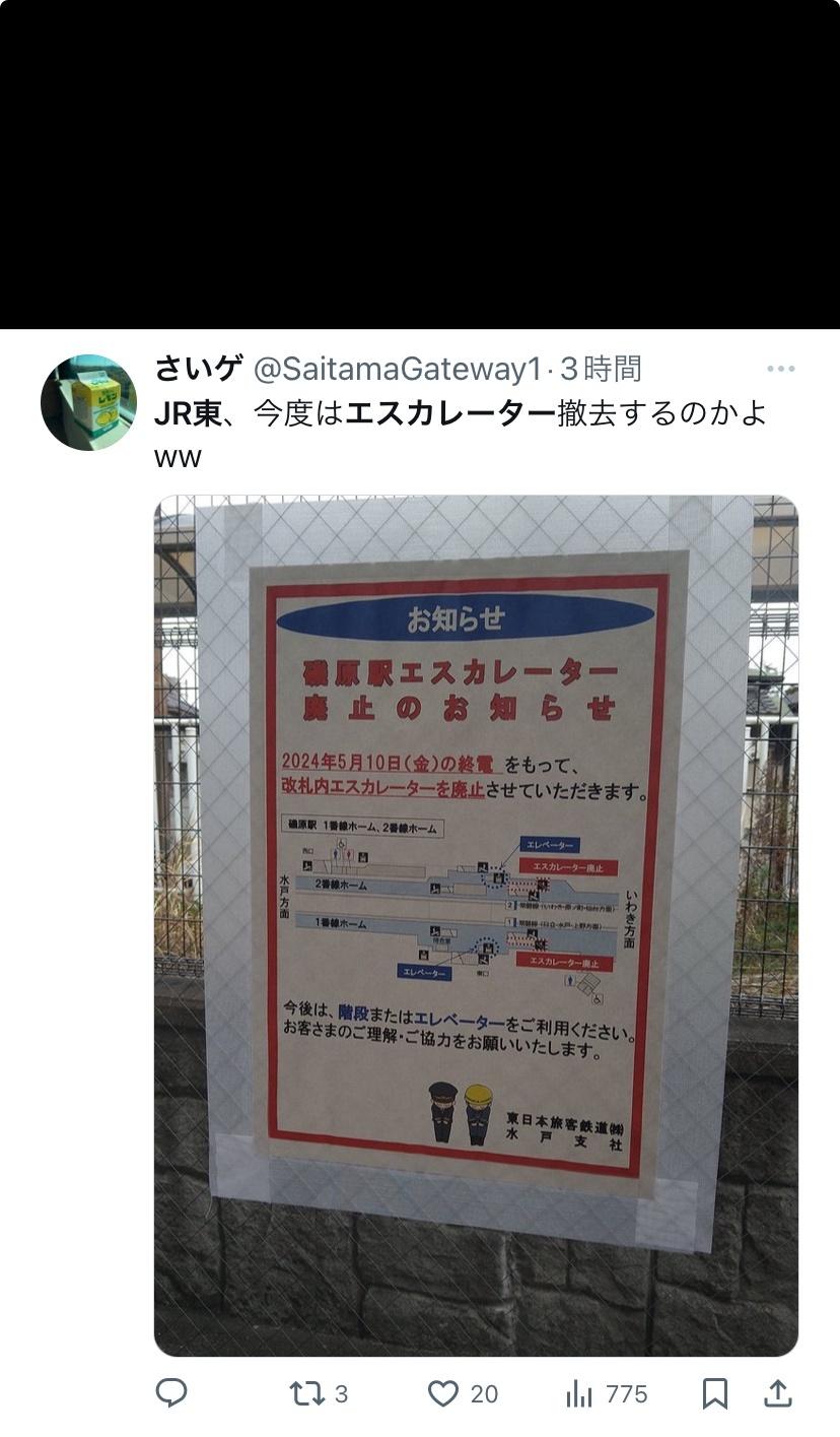 【画像】JR東、ついにエスカレーターまで撤去開始wwwww