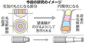 髪の毛など体毛を生み出す組織が皮膚上でどのように形作られるのか、理化学研究所などのチームが明らかにした。毛を生やす「毛包(もうほう)幹細胞」が、従来の定説とは違う細胞からできていることを突き止めた。将来的に毛髪再生といった応用につながる可能性もある。(省略)全文