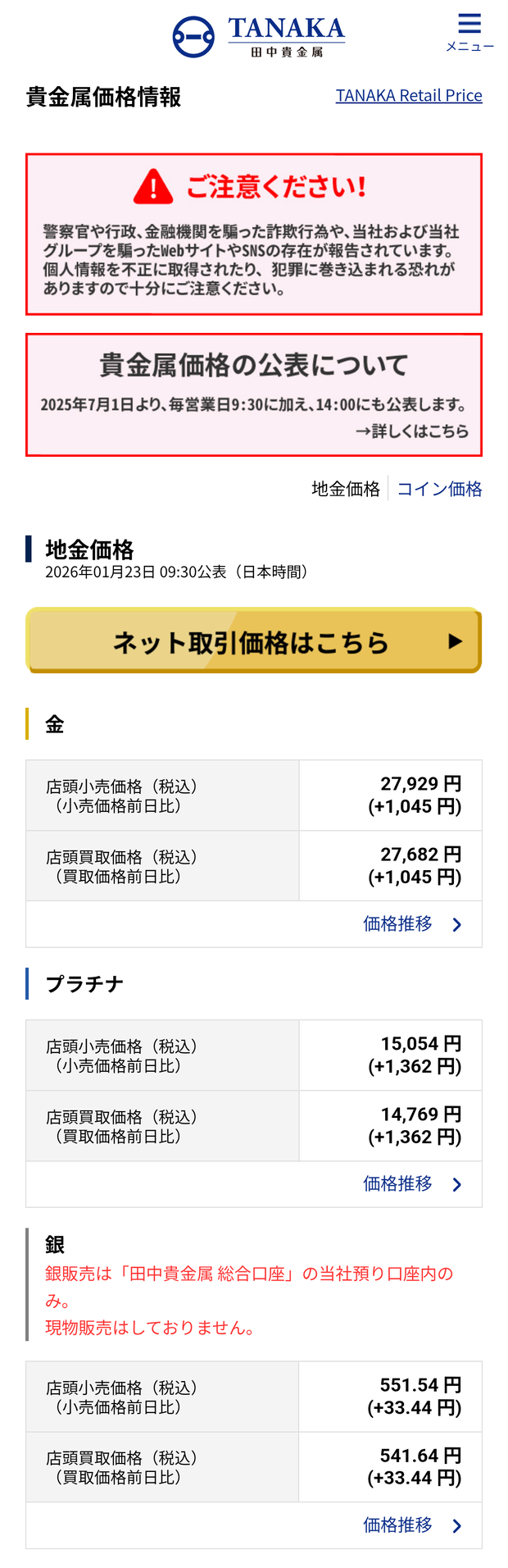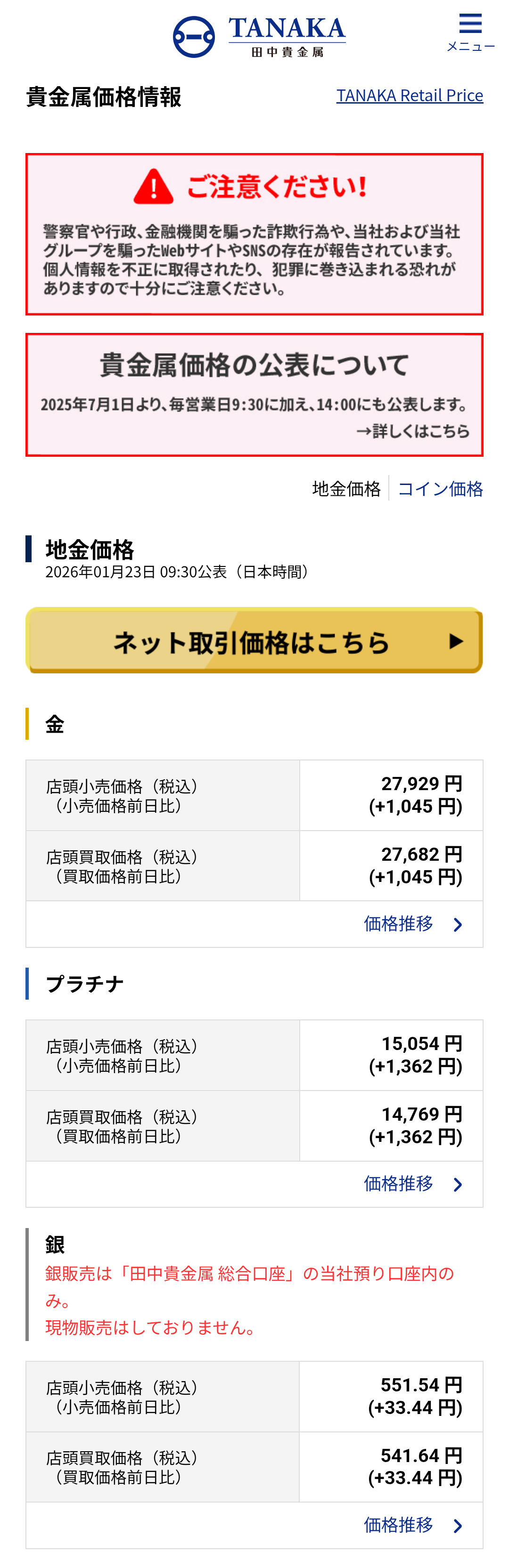 1:2026/01/23(金) 09:55:20.33 ID:CFcgHk+P0.net金もプラチナも見たことない数字で動いてるぞ…